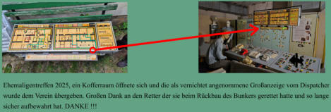 Ehemaligentreffen 2025, ein Kofferraum öffnete sich und die als vernichtet angenommene Großanzeige vom Dispatcher wurde dem Verein übergeben. Großen Dank an den Retter der sie beim Rückbau des Bunkers gerettet hatte und so lange sicher aufbewahrt hat. DANKE !!!